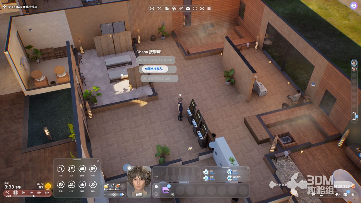 在度假村点击水疗的床,选项都是灰的,需要让我们成为水疗客人才可以进行水疗。
