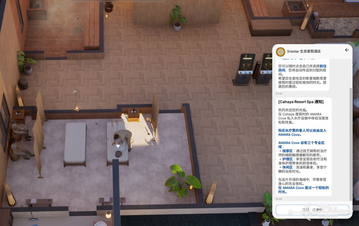 在度假村中想要体验水疗,首先需要获得水疗资格。直接点击水疗床会发现选项都是灰色,此时需先成为“水疗客人”。玩家可在房间前的自助服务机花费300购买一张水疗券,购买后系统会发来确认短信。完成后即可正式使用水疗床等设施,享受完整的度假村水疗服务。