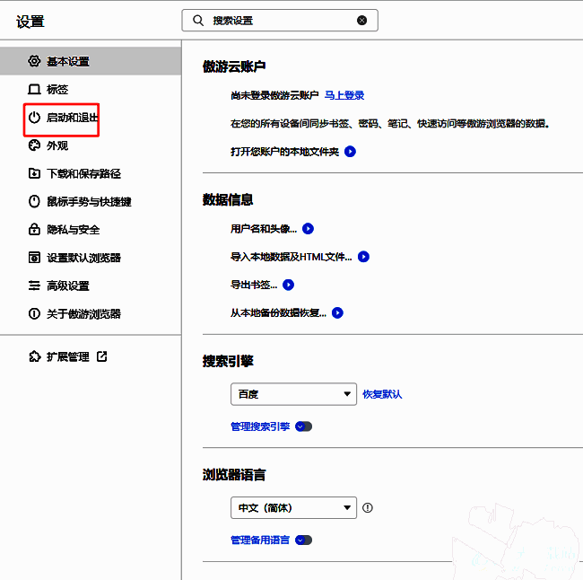 3、在打开的窗口界面中,点击左侧栏中的"启动和退出"选项。