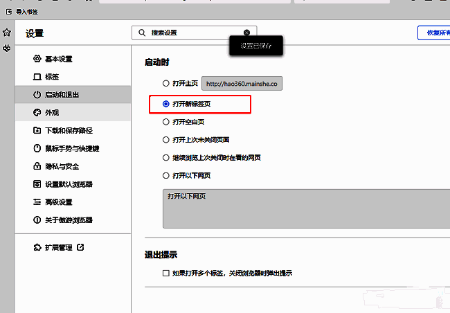 4、然后找到右侧"启动时"一栏中的"打开新标签页"选项,最后将其勾选上就可以了。