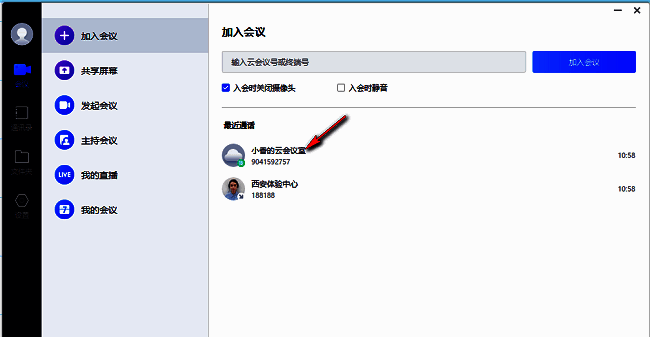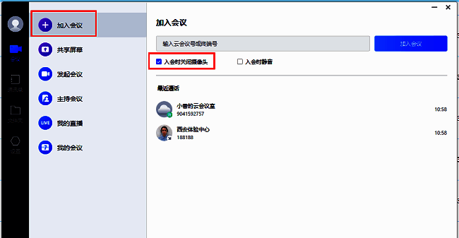 1、双击打开软件,点击左侧栏中的"会议",接着点击"加入会议",找到右侧中的"入会时关闭摄像头",将其小方框勾选上。