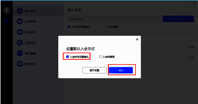 3、最后在弹出的窗口中,将"入会时关闭摄像头"小方框勾选上,随后点击"确定"就可以了。