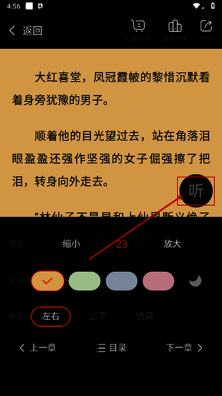 点众小说app怎么听书,在书城里面选择喜欢的小说进入,点击"开始阅读"进入阅读界面,点击中间区域呼出菜单,点击右边"听"功能,进入后即可免费开启听书了,还可以进行调整语速、定时等,点击音色右边的"切换声音",最后选择所需音色即可。