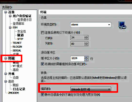 3、然后点击左侧栏中的"终端"选项,最后点击"编码"右侧的选项框下拉按钮,选择列表中的"Unicode(UTF-8)",这样是为了避免日志文件会出现乱码的情况。