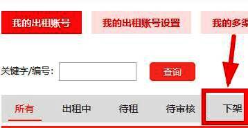 2、进入到新的窗口界面后,可以在"我的出租账号"中查看到所有上架的信息,选中需要下架的账号,点击"下架"按钮,然后根据给出的提示进行操作就可以了。