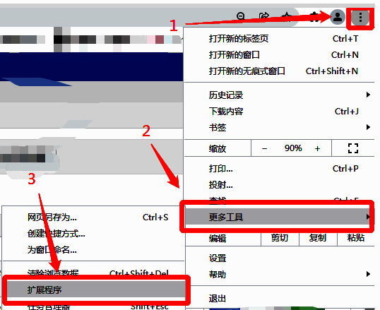 2、接着双击打开Chrome浏览器,点击右上角的三个点图标,选择下方选项列表中的"更多工具",再点击其中的"扩展程序"选项。