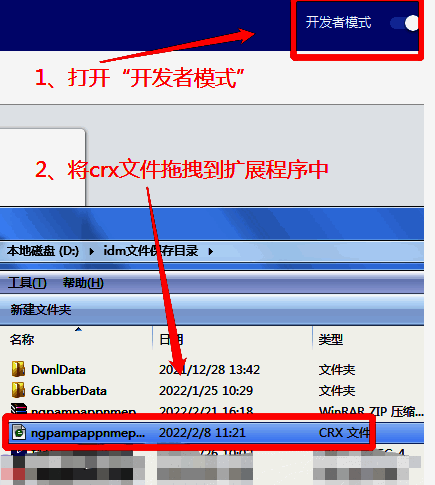 3、进入到新的窗口界面后,找到"开发者模式",将其右侧的开关按钮打开,并将"crx文件"拖拽到扩展程序中即可将IDM下载器安装到浏览器了。