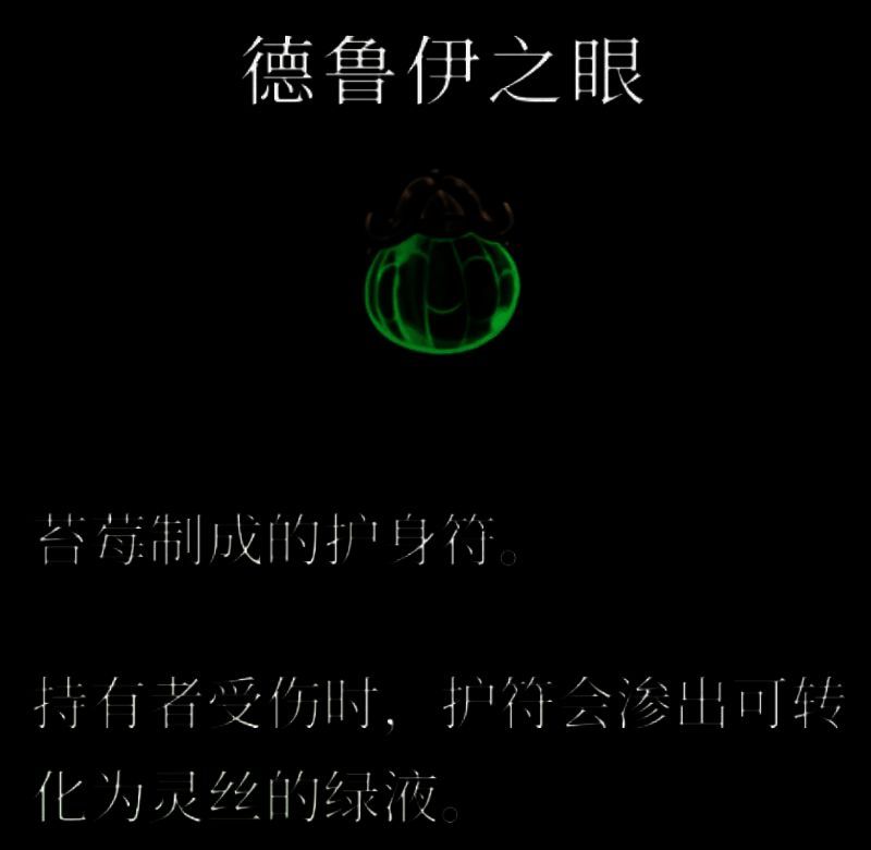 护符效果:持有者受伤时,护符会渗出可以转化为灵丝的绿液(即受击回蓝)
