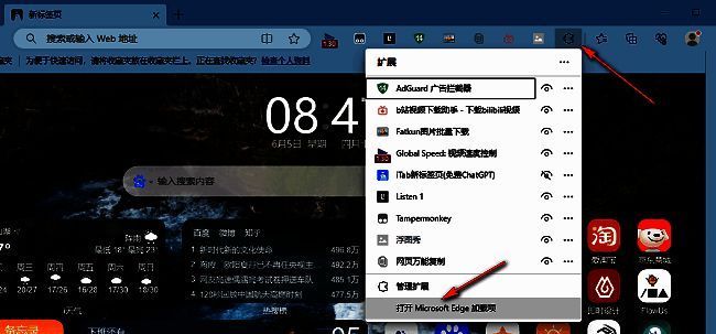 1、双击打开软件,点击上方工具栏中的"扩展"图标,接着点击下方选项列表中的"打开Microsoft Edge加载项"。