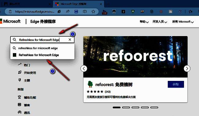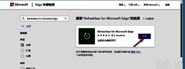 2、进入到新的窗口界面后,在左上角搜索框中输入"Refreshless for Microsoft Edge",回车搜索。