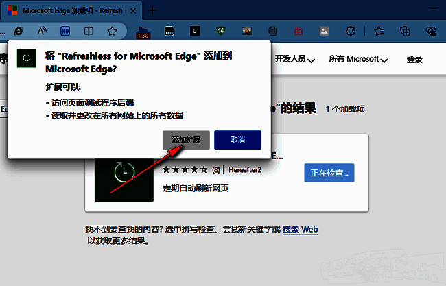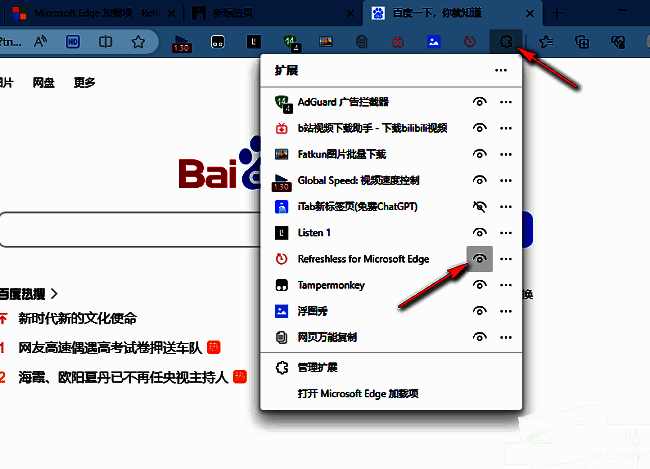 5、添加完成后,点击上方中的"扩展"图标,找到"Refreshless for Microsoft Edge",将其右侧的眼睛图标打开,让其显示在工具栏中。