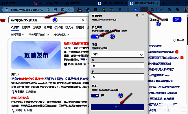 6、最后打开一个需要刷新的页面,点击上方工具栏中的"刷新"图标,在下方给出的选项框中,将"自动刷新"下方中的开关按钮打开,并设置一个合适的自动刷新时间间隔,随后点击"应用"即可。