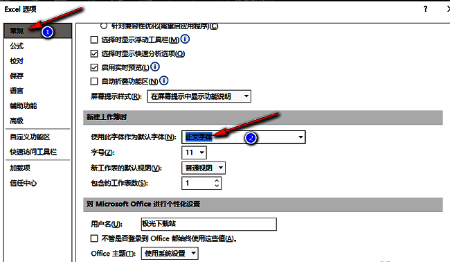 3、在打开的窗口界面中,点击左侧栏中的"常规"选项,然后找到右侧中的"使用此字体作为默认字体"。