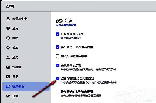 4、然后找到右侧中的"语音/视频通话自动云录制",最后将其小方框勾选上就可以了。