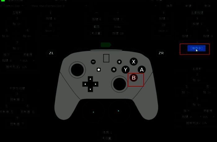 5、选择手柄设备后,ab键和ns手柄位置相反,点击右侧主要按键的A选项按键1,在按一下手柄上的A键,点击B下面的按键0,在按一下手柄上的B键。