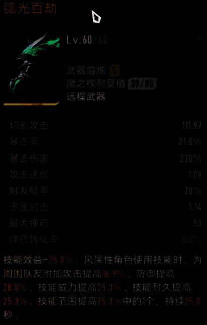这个弓箭外观看起来非常轻盈,除了单纯的外观设定之外还会带有光环,进入光环可以指引玩家瞄准对手,假如在游戏里玩家可以持续提升装备的等级,那后期还能获得230%的暴击伤害,同时还能得到10点攻击能力得额外提升,想获取更强战斗能力的玩家,可以选择不断去提升弓箭的等级,并且把角色调整成风属性的人物,这样也能得到额外的加成。