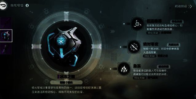 而冰冻之握则隶属于控制和输出装备的模组,该模组一共有三个技能,特色技能低温帷幕,充能进战绝对零度和被动技能急冻。