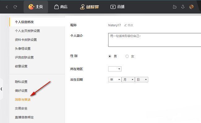 3、在打开的窗口界面中,点击左侧栏中的"消息与推送"选项。