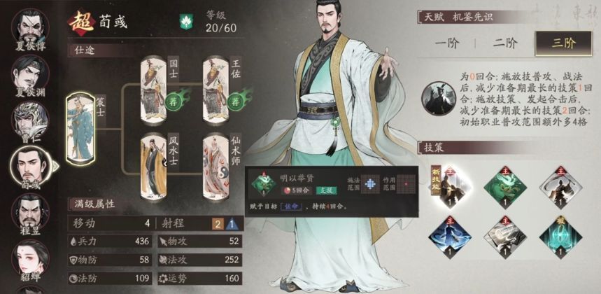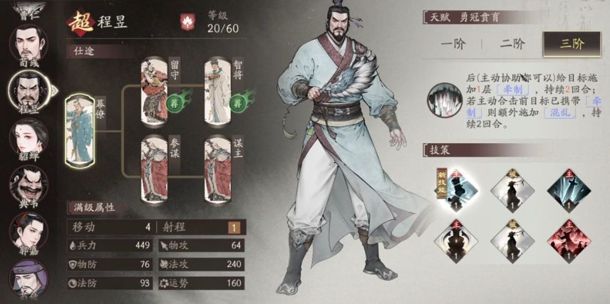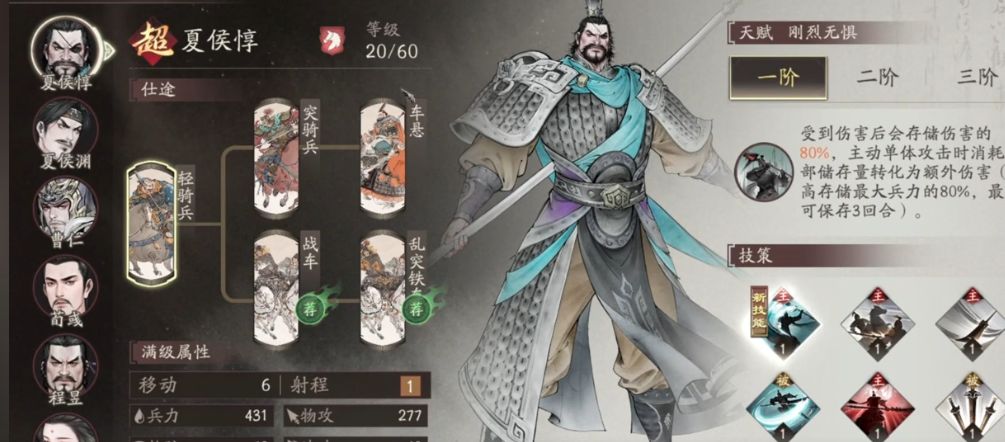 郭嘉:2阶核心主要是提升普通攻击,还有战法,在这一个游戏中,射程优势是比较显著的,因此优先度比较高,三阶虽然可以延长控制的效果,但二阶已经足够使用。徐晃:2阶可以有效增加15%的暴击率,因此提升还是比较明显的。3阶的攻心转护盾效果比例极低,不需要去升级。夏侯惇:2阶残血时大概会有32%的兵力回复,没有奶妈的时候就可以使用。3阶回复效果略增,但整体的优先级并不高。于禁:2阶协助友军触发奋战会拥有一个无视75%防御,实际上只不过是多了100多伤害,所以也没有必要选择去优先升级。荀攸:2阶每回合仅多3%法攻,提升最小,1阶即可用。