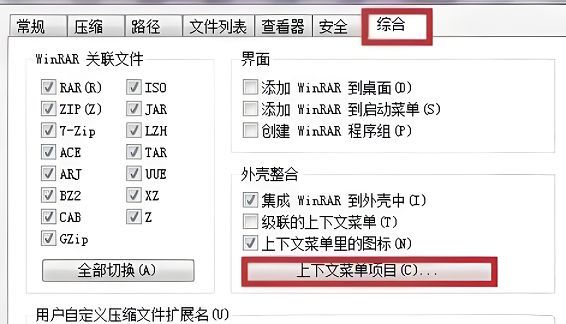 2、在打开的窗口界面中,点击上方中的"综合"选项卡,再点击下方中的"上下文菜单项目"。