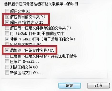 3、然后找到其中的"解压到当前文件夹"、"解压到<文件夹>"以及"添加到<压缩文件名称>",最后将其小方框勾选上,随后点击"确定"就可以了。