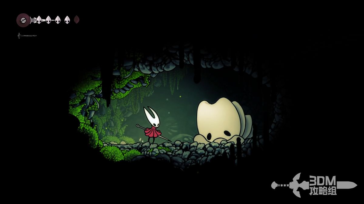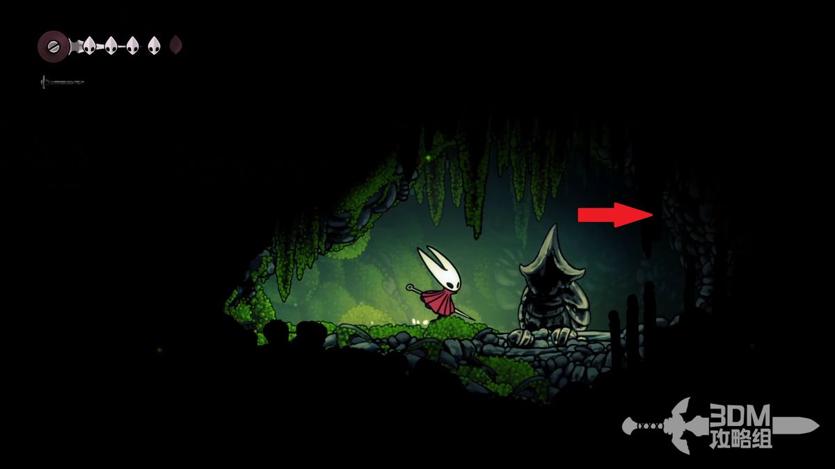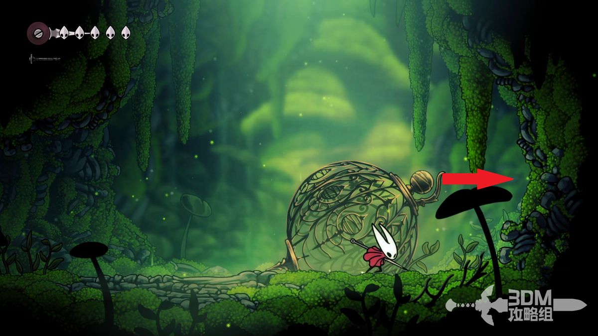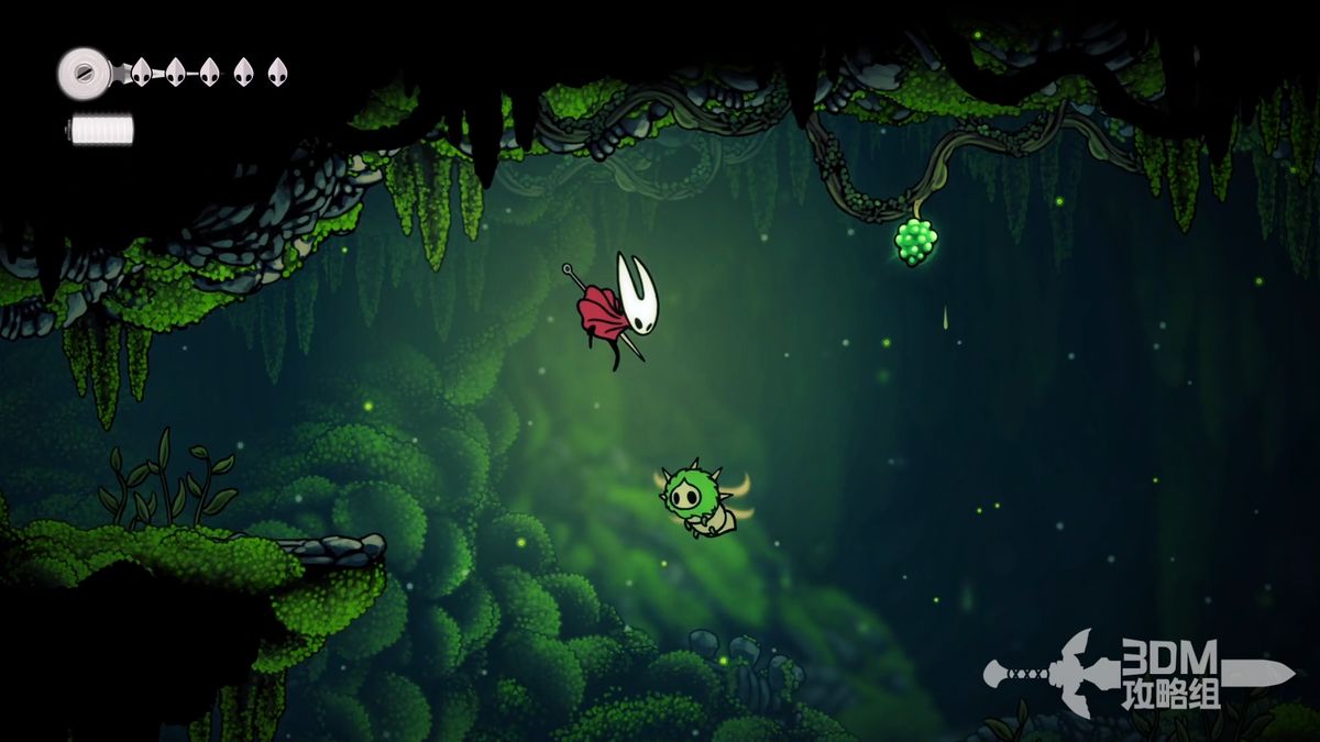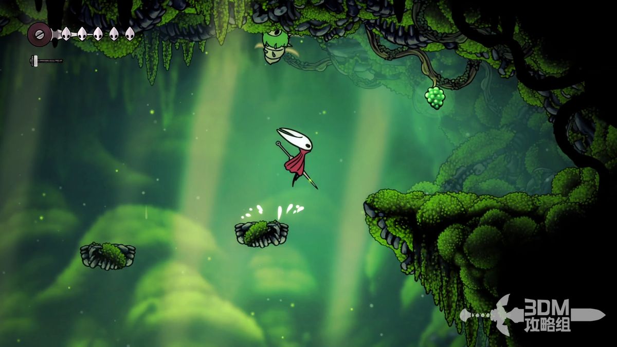 准备离开苔穴时可以看见一些普通跳跃无法直接上去的台阶,但是它们的上面是完成祈愿任务收集莓果的必要道具,可以通过下劈(向下+攻击键)击打怪物完成向上跳跃的动作以此到达原本无法到达的一些区域。在离开苔穴的途中可以获得两颗苔莓,位置分别是初始区域的右上角和颓败教堂椅子处右侧直走的顶部。这个苔莓比较难获得,如果怪物被意外打死可以去坐椅子刷新再打一次。提前得到两颗莓果可以方便之后接到任务时不必返回苔穴。