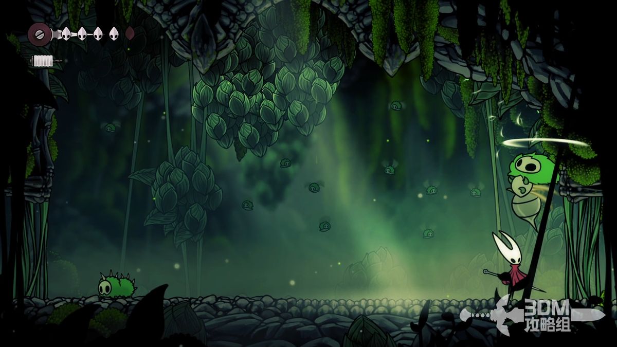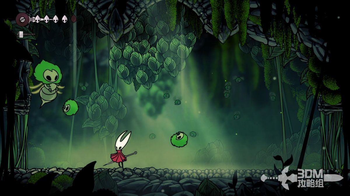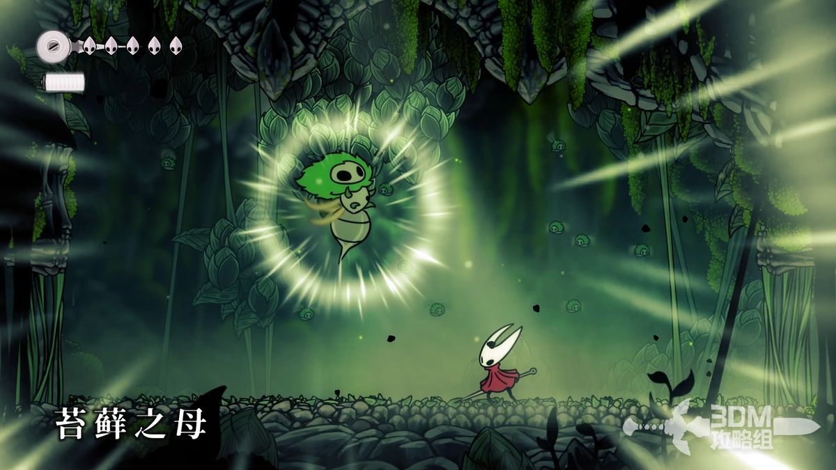 拿到两颗苔莓后回到颓败教堂向上走会遇到第一个BOSS苔藓之母,这个BOSS非常类似空洞骑士的BOSS格鲁滋之母