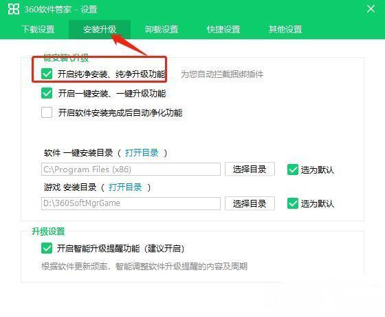 3、在打开的窗口界面中,点击上方中的"安装升级"选项卡,然后找到下方中的"开启纯净安装、纯净升级功能",最后将其小方框勾选上即可。