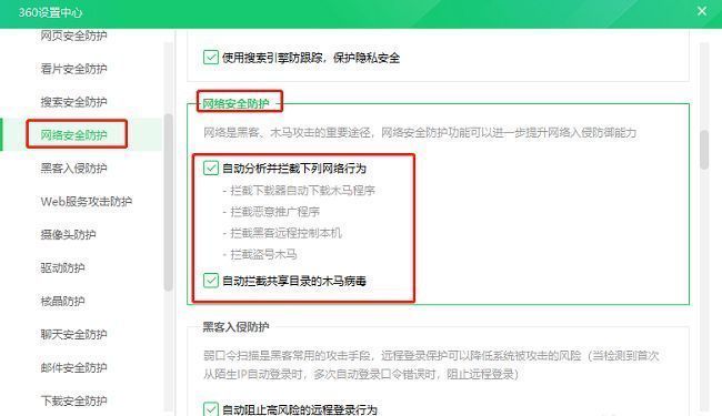 5、然后在打开的窗口界面中,点击左侧栏中的"网络安全防护"选项,最后将右侧"网络安全防护"下方中的两个选项的小方框都勾选上就可以了。