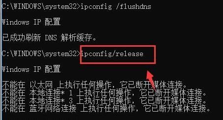 4、在接着输入"ipconfig/release",回车执行命令。