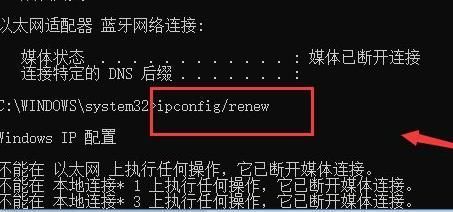 5、然后输入"ipconfig/renew"命令,回车获取新的IP。
