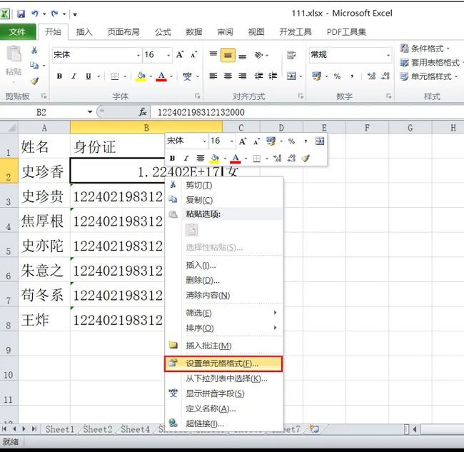 1、双击打开软件,右击显示不全身份证号码所在的单元格,选择选项列表中的"设置单元格格式"。
