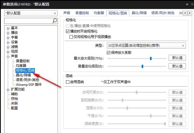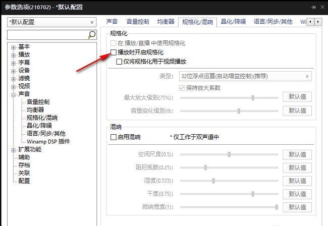 4、然后找到右侧中的"播放时开启规格化",最后将其小方框勾选上就可以了。