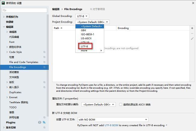 4、再点击"project Encoding"选项框的下拉按钮,选择选项列表中的"UTF-8"。