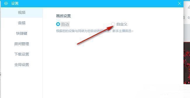 2、在打开的窗口界面中,找到右侧中的"画质设置",将其中的"自定义"勾选上。