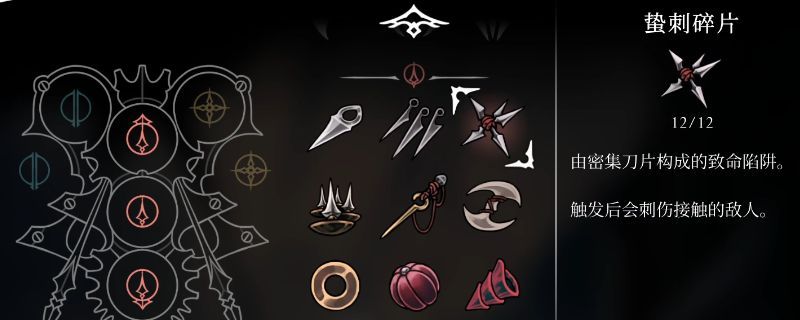 《空洞骑士:丝之歌》中的道具可以大致分为蓝色道具和红色道具,而红色道具的效果和获得方法各不相同,首先是三重镖,分层扁平武器,可成传投掷,然后是蛰刺碎片,由密集刀片构成的致命陷阱。触发后会刺伤接触的敌人。