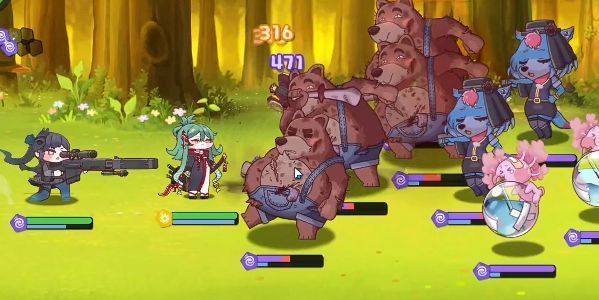 一个是反伤类型的前排,拥有弹伤的效果,可以反弹伤害,之后的赛琳娜、雨伊是中排输出类型的角色,这两位角色的话都为全体输出类型的角色,可以给到敌人aoe伤害,这个伤害可以吃到140%的加成效果,在克制的情况下两个aoe下去可以击杀大量敌人。