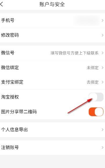 4、在该页面上选择【淘宝授权】功能,将其开关按钮点击开启就好了。