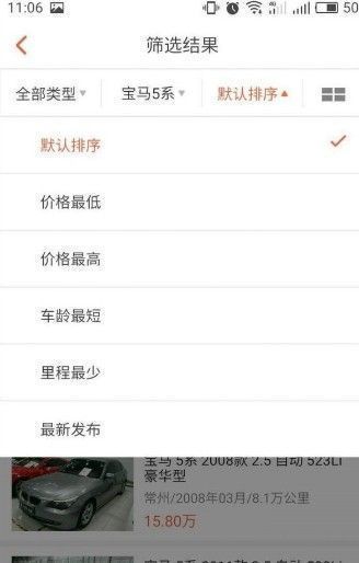 2、选择品牌后系统会按照智能排序为您自动罗列相关的二手车;