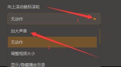 4、然后找到右侧中的"向上滚动鼠标滚轮",点击选项框的下拉按钮,最后在给出的列表中的选择"加大声音"选项即可。