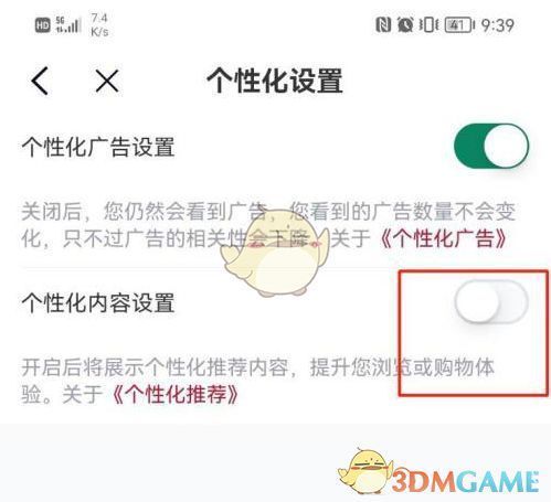 5、点击【个性化内容设置】后的绿色按钮,待显示灰色即可关闭,详见下图所示。