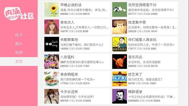 功能上,《内涵段子社区 TV版》涵盖文字段子、短视频、搞笑囧图以及脑洞神评论等多个板块,覆盖搞笑、情感、音乐、萌宠、游戏等多种题材,满足不同用户的多元化娱乐需求。