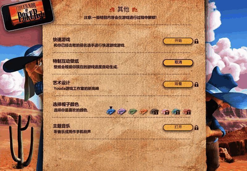 创 意:玩家可通过赢得的金钱买卖房屋建筑,购买马匹,当你占领了一个城市后,还可以向新的地点出发,比起单纯的博彩游戏,《州长扑克2》更具趣味性。