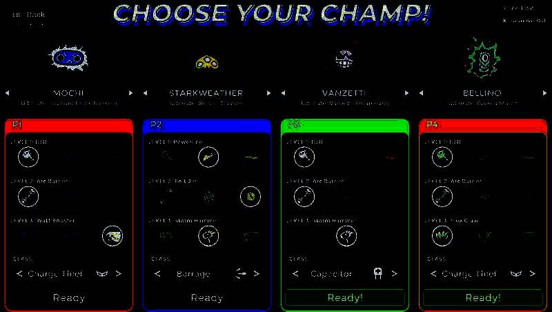 《冲锋陷阵(Charge Champs)》是Spaghetti Yeti Studios制作并发行的一款多人2D平台格斗游戏,在游戏中玩家将从多名角色中选择一个,在与对手对抗的过程中不断给自己的角色充电,从而能够释放强大的技能,抢占先机,努力将所有的对手打败,成为冲锋陷阵的冠军!