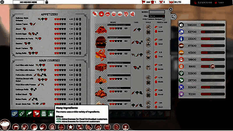 《厨师:餐饮大亨(Chef: A Restaurant Tycoon Game)》是Inner Void制作,Digital Tribe发行的一款餐厅模拟经营游戏,在游戏中玩家将经营一家受人欢迎的餐厅,在其中你可以创建自己的专属菜品来供食客品尝,可能是美味佳肴也可能是黑暗料理。