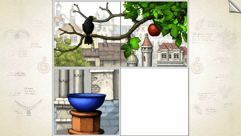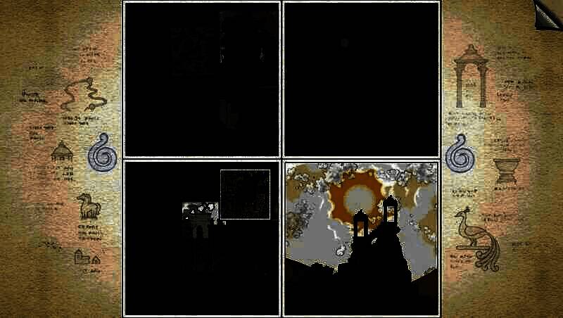 游戏界面由2×2个正方形的画布组成,每个正方形都是独立屏幕的手绘插画。通过移动、缩放、拼接、切换等操作,玩家可以将不同的画面连接起来,比如将元素从一幅画拖动到另一幅画,或者改变画面的视角和缩放比例,从而形成一个新的场景来解谜,推动故事的发展。