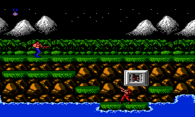 玩家在开始时持有普通单发步枪,可以向八个方向发射,但是在得到其它武器之后会换用得到的武器。玩家可以跳跃并在跳跃时使用方向键来控制移动和射击时的方向,而且跳跃时候的方向控制在游戏当中十分重要。和敌人以及发射的弹药直接接触会导致玩家的直接死亡。但是他们经常会充满整个屏幕,并且往各个方向移动,所以回避它们需要一些技巧。游戏中不时会有“武器胶囊”出现,击落它们可以出现武器,获得这些东西可以增强玩家的攻击火力,但是它们在玩家死亡之后会立刻丢失。下面出现的是游戏当中的各种宝贝。在游戏中,它们以标有一个字母的红色猎鹰表示。