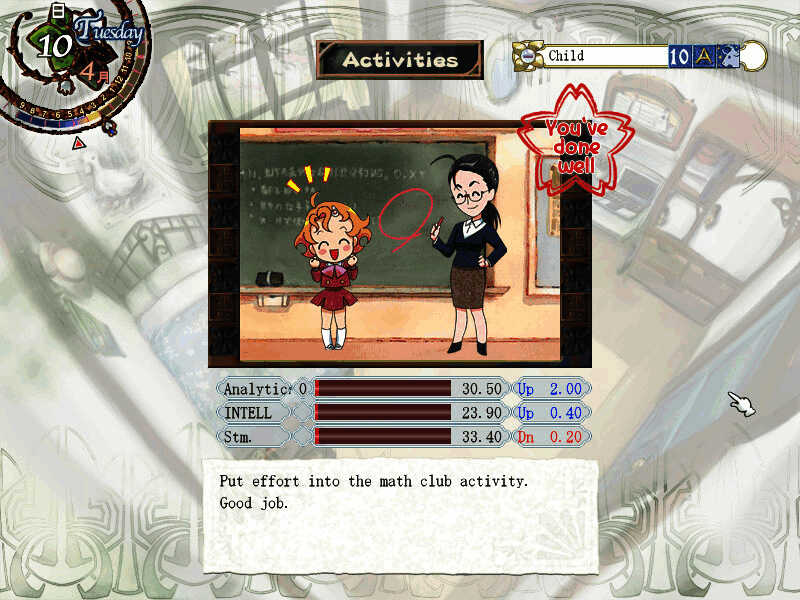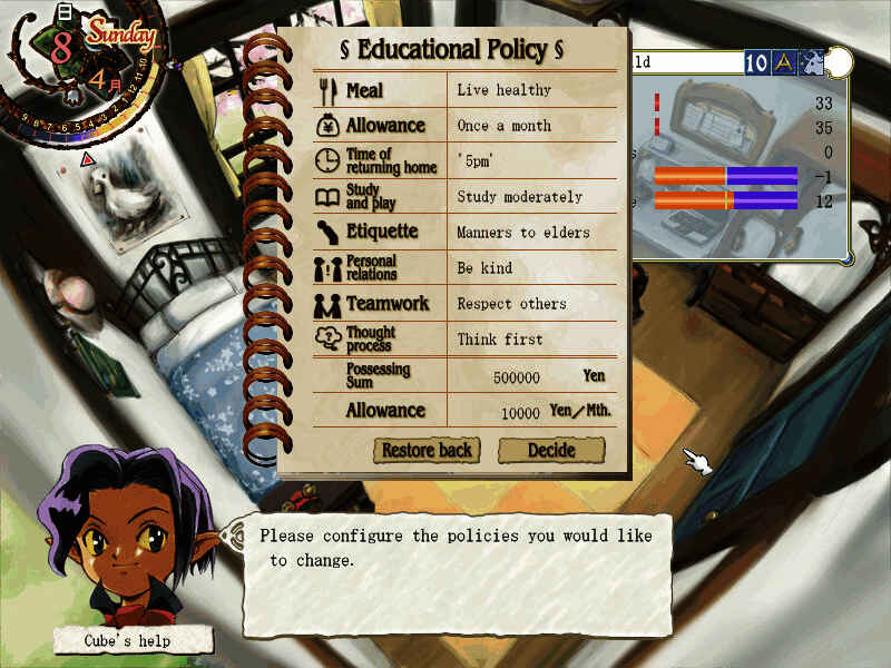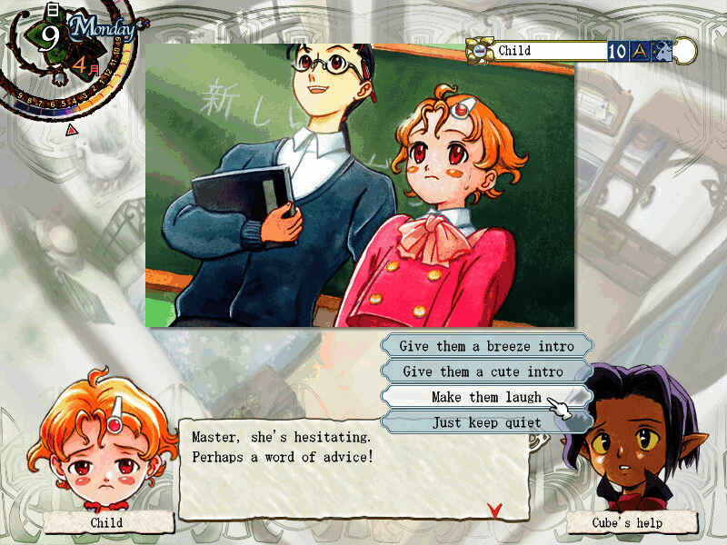 4、初玩的人也能够安心的帮助机能 就算是刚开始接触PC游戏的人也能够安心。游戏同时搭载了美少女梦工厂2中登场的执事一角、将游戏的进行方式以及攻略要点等详细告知的帮助机能。另外在游戏中表示出来的选择肢和重要项目等、只要操纵光标都将有对于名词和内容的表示说明。是一个能使玩家集中于女儿培养的系统。