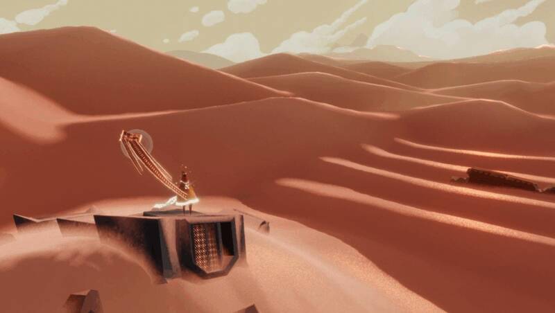 游戏中,角色初始位置设在一个巨大的沙漠当中,当角色爬上一个第一个立着几个碑柱的沙丘后,就能够看到一座迸发出直通云霄光柱的高山,那里也是本次游戏的终点。要到达终点这座高山,一共要经过沙漠、谷底、高塔和雪原4个场景,此间有昏天黑地的沙暴、断壁残垣的桥梁、宫殿和神庙。每个关卡内,角色需要唤醒的东西都是不一样的,比如在沙漠场景中角色要唤醒的东西就是壁画、符文甚至是一个路标。每个场景都是有边界的,当角色接近场景边界后就会出现强风将玩家吹向相反方向,让角色无法穿越。