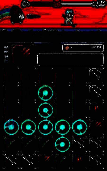战斗画面分上下两部分,上面是战斗动画,下面是方块阵。左上角比较大的图标表示你手上的方块,点击下方的方块阵,手上的方块就会和点击的方块交换,四个以上相同方块相连就会消除。因为是即时战斗的关系,所以很强调操作的连续性,越快越好。